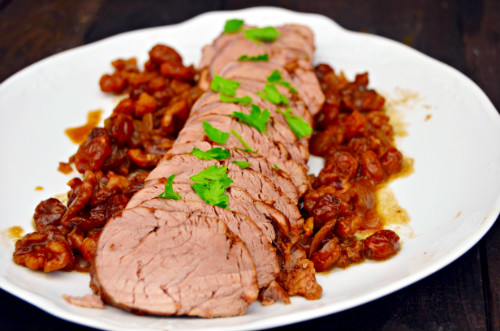 Comenzamos sellando en una sartén el solomillo de cerdo por todos los lados, una vez que lo hemos sellado lo retiramos de la sartén. En el mismo aceite rehogamos la cebolla, cuando la cebolla este transparente añadimos de nuevo el solomillo, regamos con el Oporto y añadimos las pasas y las nueces.
