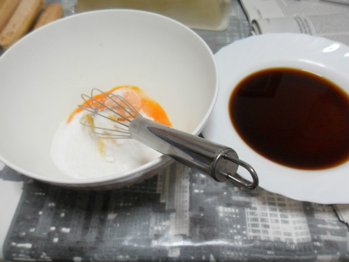 En un bol se mezclan las dos yemas de huevo con los 100 gr. de azúcar hasta conseguir una crema espumosa