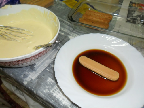 Añadir a la crema, la tarrina de queso mascarpone y la de nata y batir enérgicamente, de mientras ir huntando los bizcochos con el café y colocándolos en una bandeja