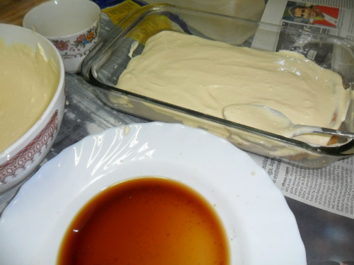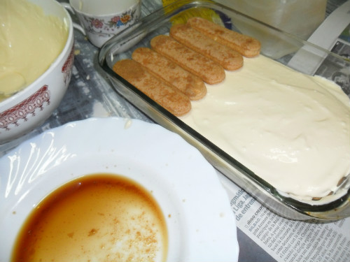 colocar otra capa de bizcochos y cubrir con el resto de la crema, meter en la nevera como mínimo 6 horas, y mucho mejor dejarla hasta el día siguiente