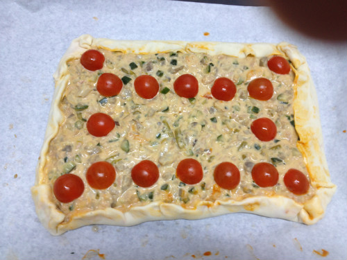 Extender cuidadosamente la masa de hojaldre en una bandeja para horno con el propio papel que trae y que evitara que se pegue (si tenemos tiempo o somos mañosas podemos hacer la masa nosotras mismas). Cubrir la masa con el tomate.