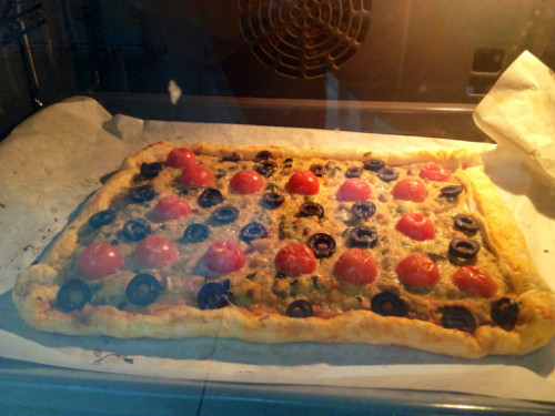 Decoramos con los tomates cortados por la mitad y las aceitunas negras en rodajas. y al horno