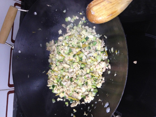 En una sarten o wok (más saludable) pochamos la media cebolla que habremos picado muy pequeñita como el resto de ingredientes. Iremos añadiendo el calabacín, las setas, los trigueros, el atún y por último salpimentamos. Dejamos reposar.