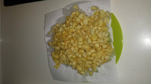 Pelamos las patatas, las lavamos y la partimos en cuadrados. Ponemos en una sartén Aceite para freír las patatas agregamos las patatas y las freímos, una vez fritas se hechán en una fuente con un papel de cocina para quitar el ésceso de Aceite y se reservan.