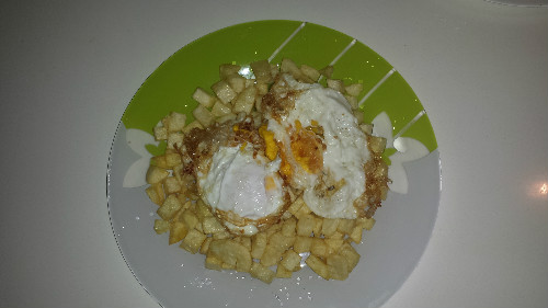 en el mismo aceite de las patatas freimos los huevos y los colocamos encima de las patatas como en la foto.
