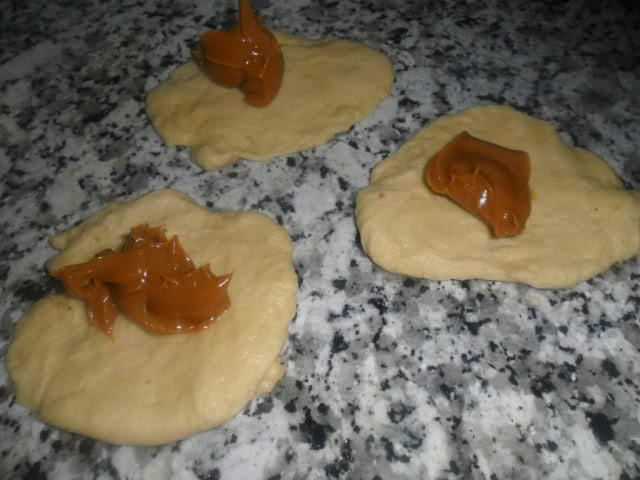 Una vez fermentado, se extraen porciones de unos 60 gr. estiramos cada porción y ponemos un podo de dulce de leche en cada una.