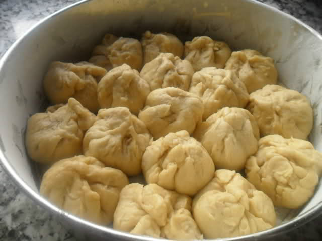 Cerramos cada porción como en forma de saquitos, apretando con los dedos para que se cierren bien, las ponemos en un molde desmontable en mantecado, lo tapamos con un paño húmedo y le dejamos fermentar hasta que halla doblado su volumen.