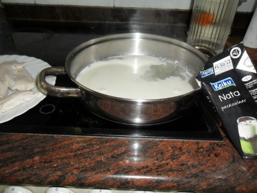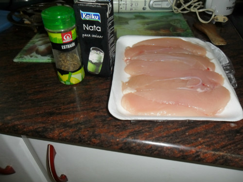 Reservar una taza del caldo de cocer las pechugas y añadirle el tetrabrik de nata y el estragón, hervir a fuego lento 5 minutos